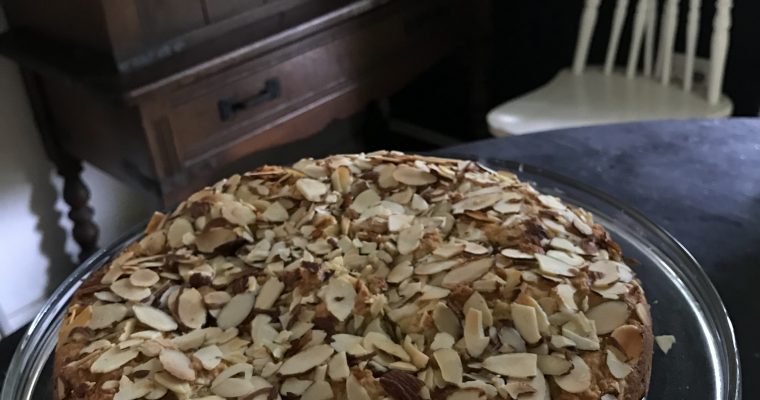 4. Pour into the cake pan and sprinkle the sliced almonds over the top. Use enough to cover the entire cake.