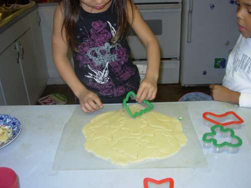Roll out the dough on a floured surface to 1/4 inch thick. Cut into shapes and place on parchment-lined baking sheets. The scraps can be combined and rolled out again. Bake 10 to 12 minutes, until the edges are a light golden brown. Cool slightly on the baking sheets before transferring to cooling racks.